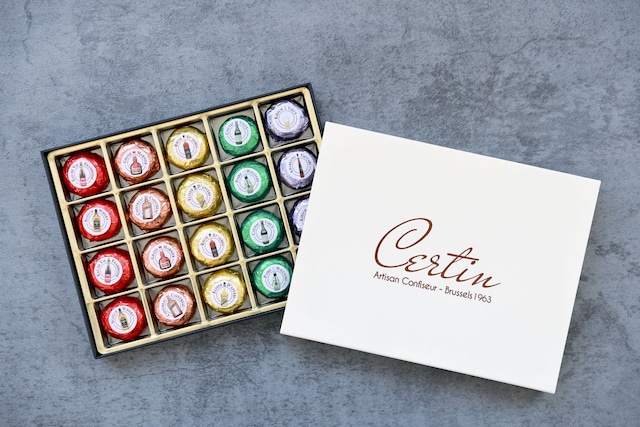 レーヴ・ドゥ・ビジューのボンボンは、5代に渡りリキュールボンボンを制作してきた家族の末裔が、ひとつひとつの工程を一人で手作りしている大変貴重かつ希少なボンボン。 たっぷりの原酒をそのままダークチョコレートに封じ込めているため、一口噛むと、カシャッとした食感でチョコレートが割れた後、リキュールが口の中いっぱいに広がります。 まるで、まわりのチョコレートをワイングラスに見立てたような特別なリキュールボンボン。 お酒のお味は全部で10種類。中にはベルギー伝統の32種もの天然ハーブやスパイスを使用したハーブ酒「エリキシール」もあり、ベルギーらしさを感じさせてくれるラインナップに。 内容量:40個(グランマルニエ・マールドシャンパーニュ・コニャック・コアントロー・スコッチウィスキー・キルシュ・ポワレウィリアムズ・ラム・フランボワーズ・エリキシール 各×4) 賞味期限:2026年4月15日 特定原材料等28品目:大豆
