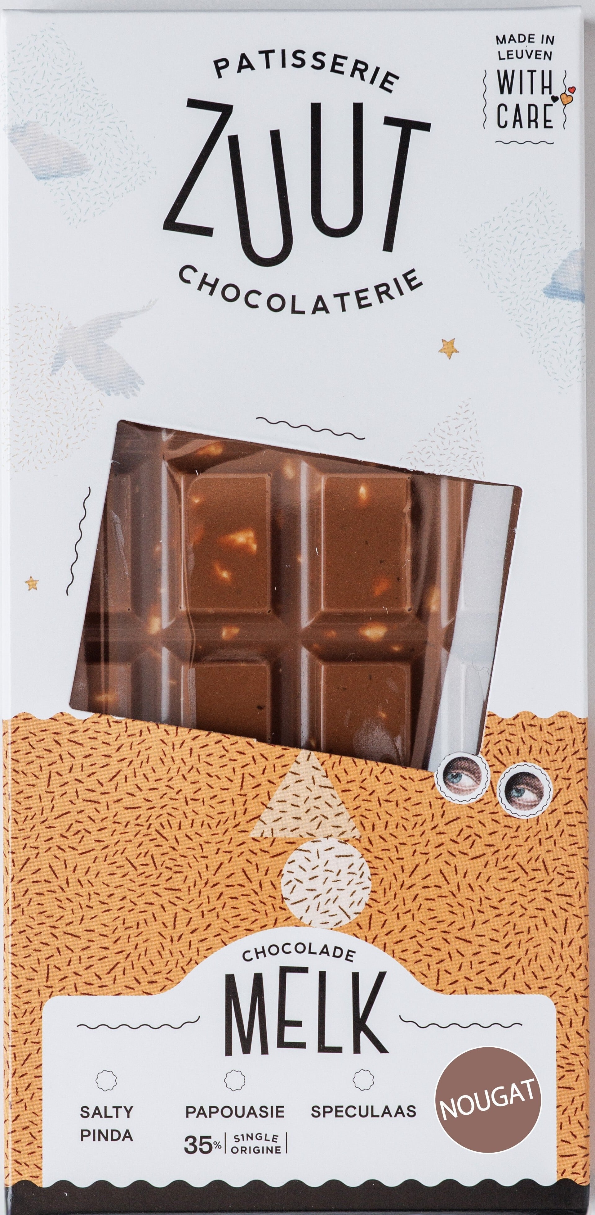 ミルクチョコレートと軽い食感のソフトキャンディー、ヌガーを合わせたチョコレート。ZUUTらしく塩を加えて飽きのこない味わい。