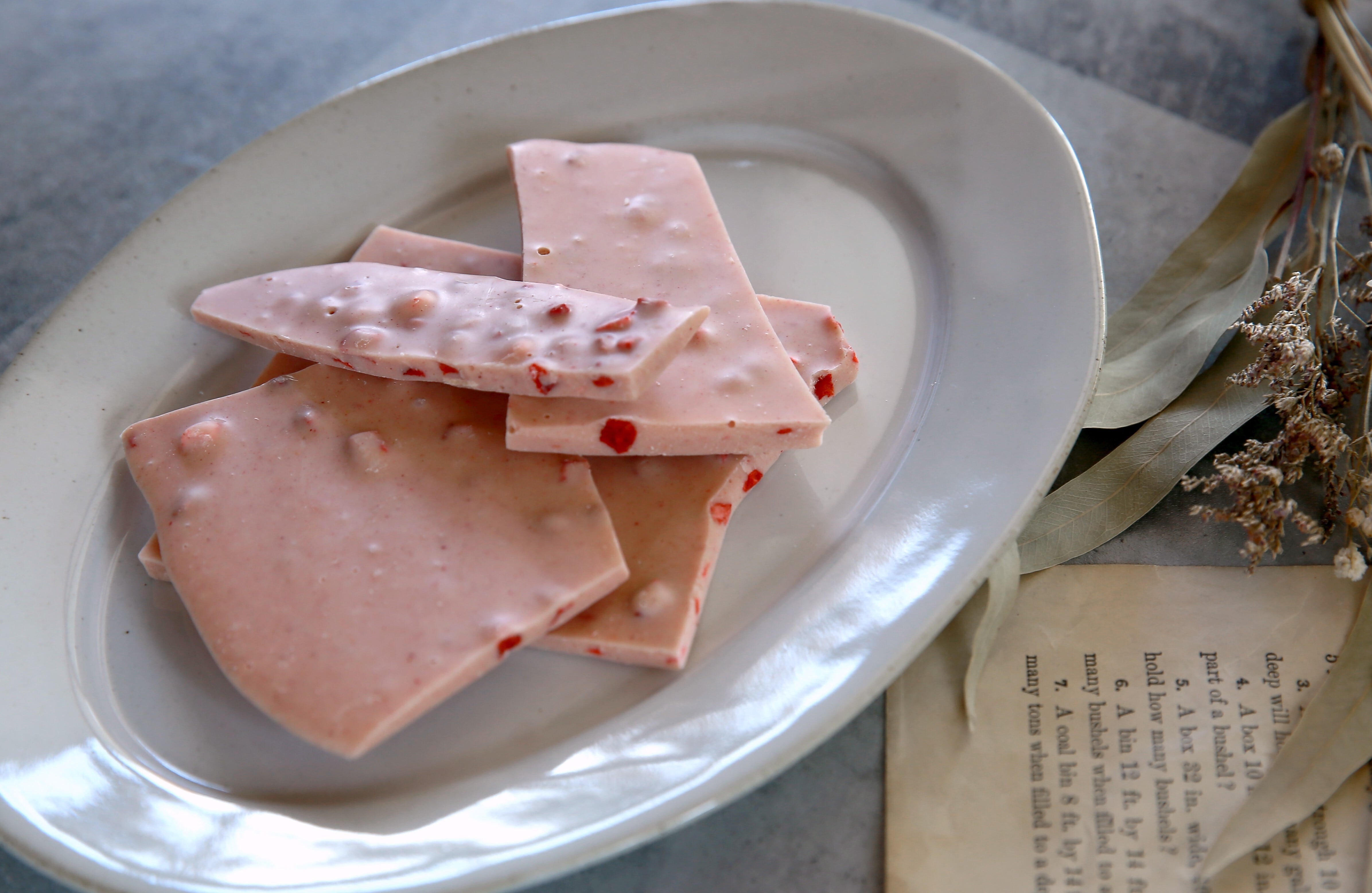 ヨーグルトを練りこんだホワイトチョコレートにラズベリーとストロベリーのドライチップを混ぜ込みコクのある甘さと華やかな酸味のチョコレート。